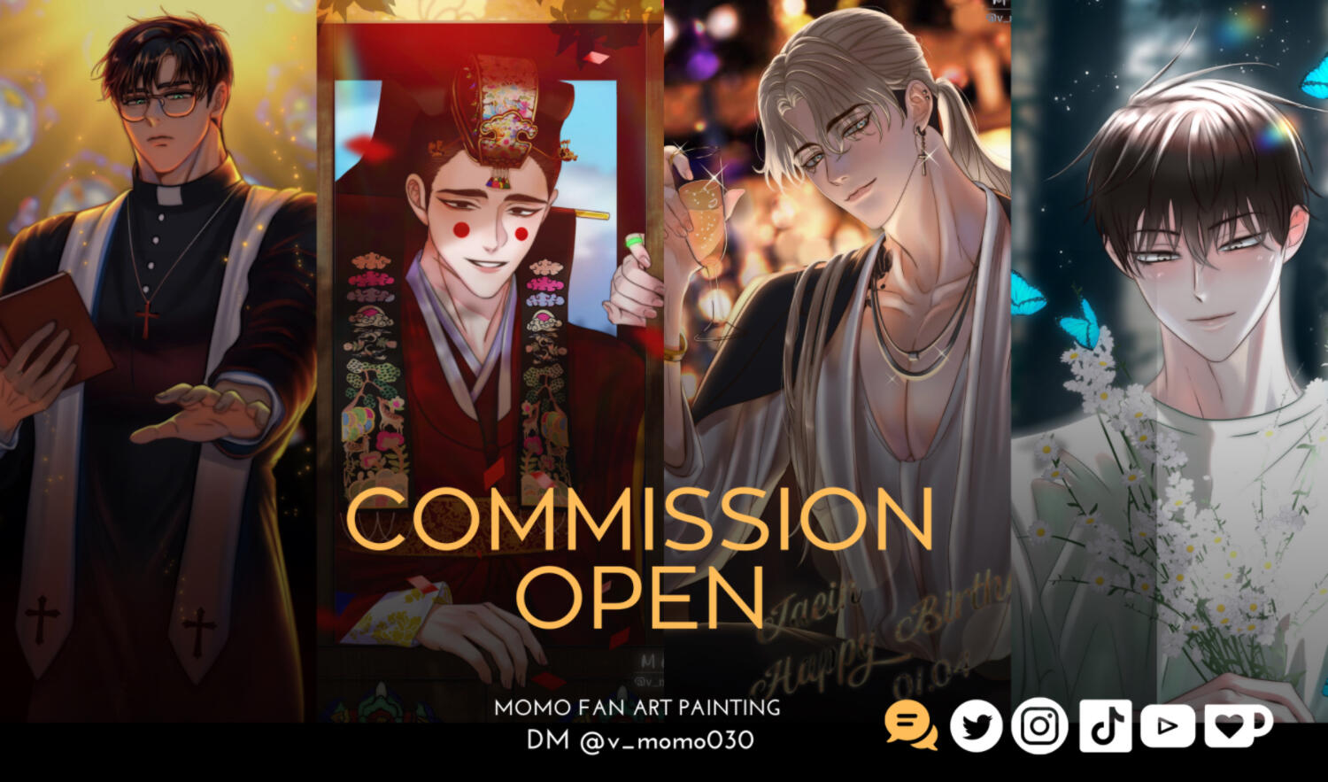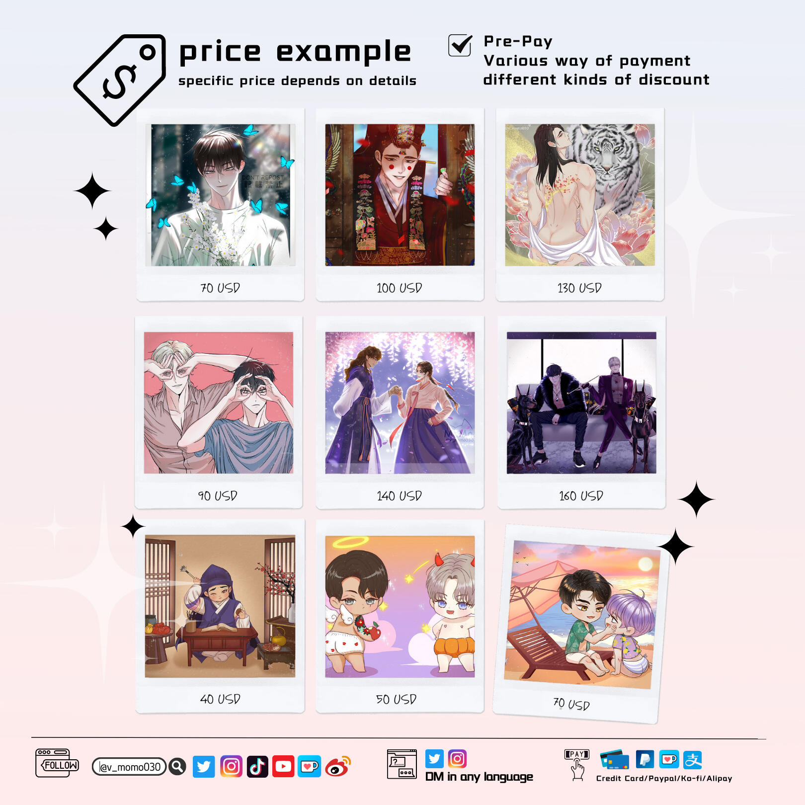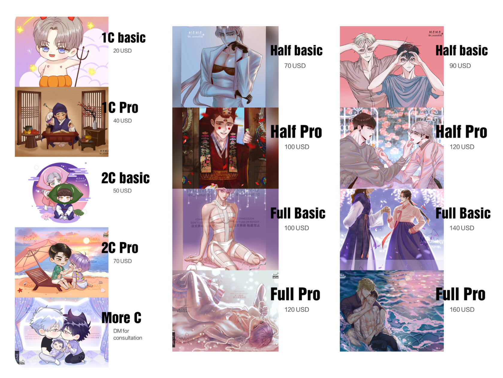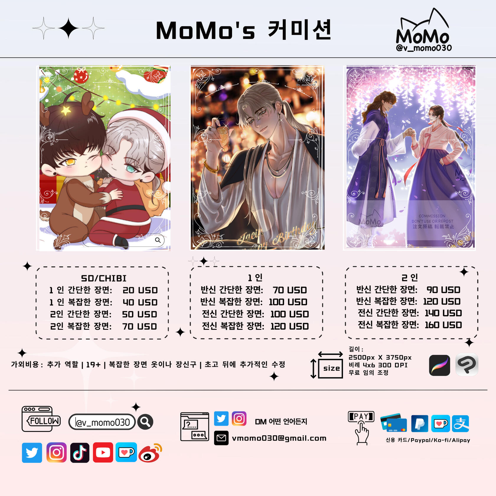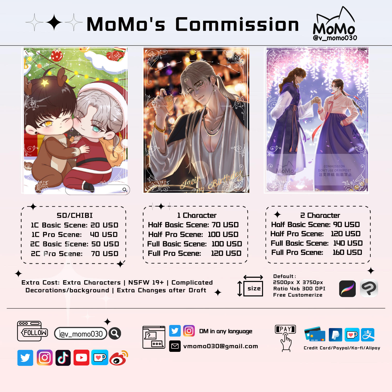 There are different options for commissions including SD/Chibi full colored painting and Normal size paintings. Commission fee depends on customer’s requirements.